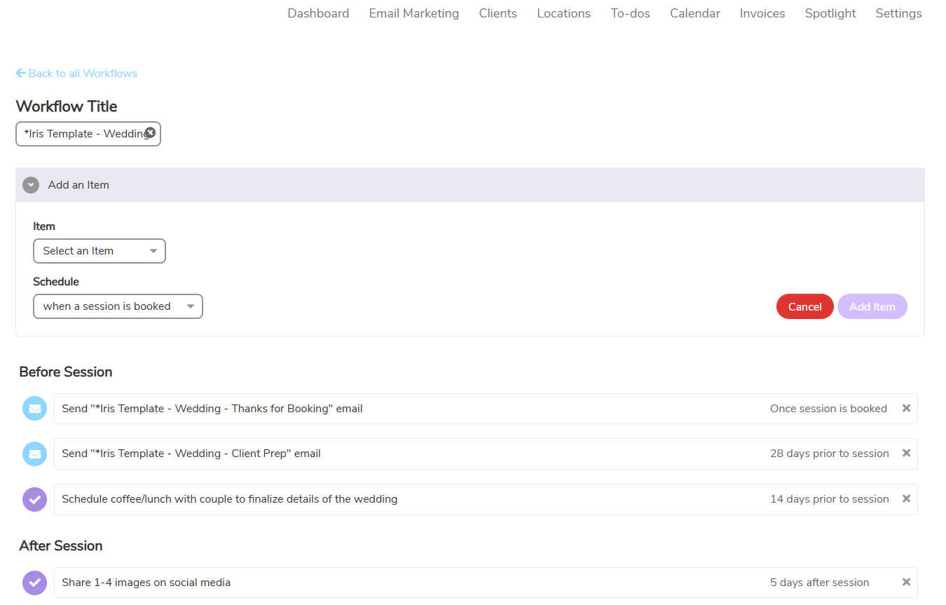 With Iris Works, photographers can create workflows that trigger automatically at each stage. Emails, reminders, contracts, and invoices happen in the right order without manual effort.